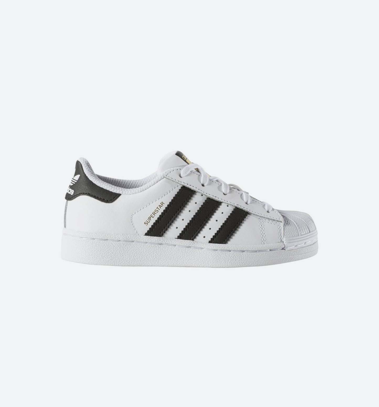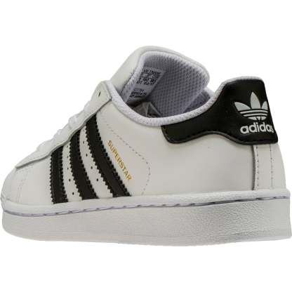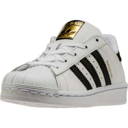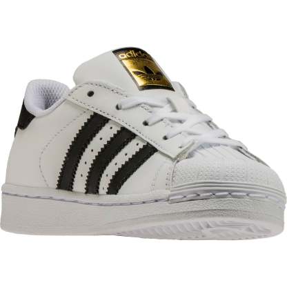 The Adidas Superstar Preschool Boys Lifestyle Shoe downsizes the classic just for little feet. These kids' shoes have a leather upper with the famous rubber shell toe synthetic leather 3-Stripes and easy strap closures.