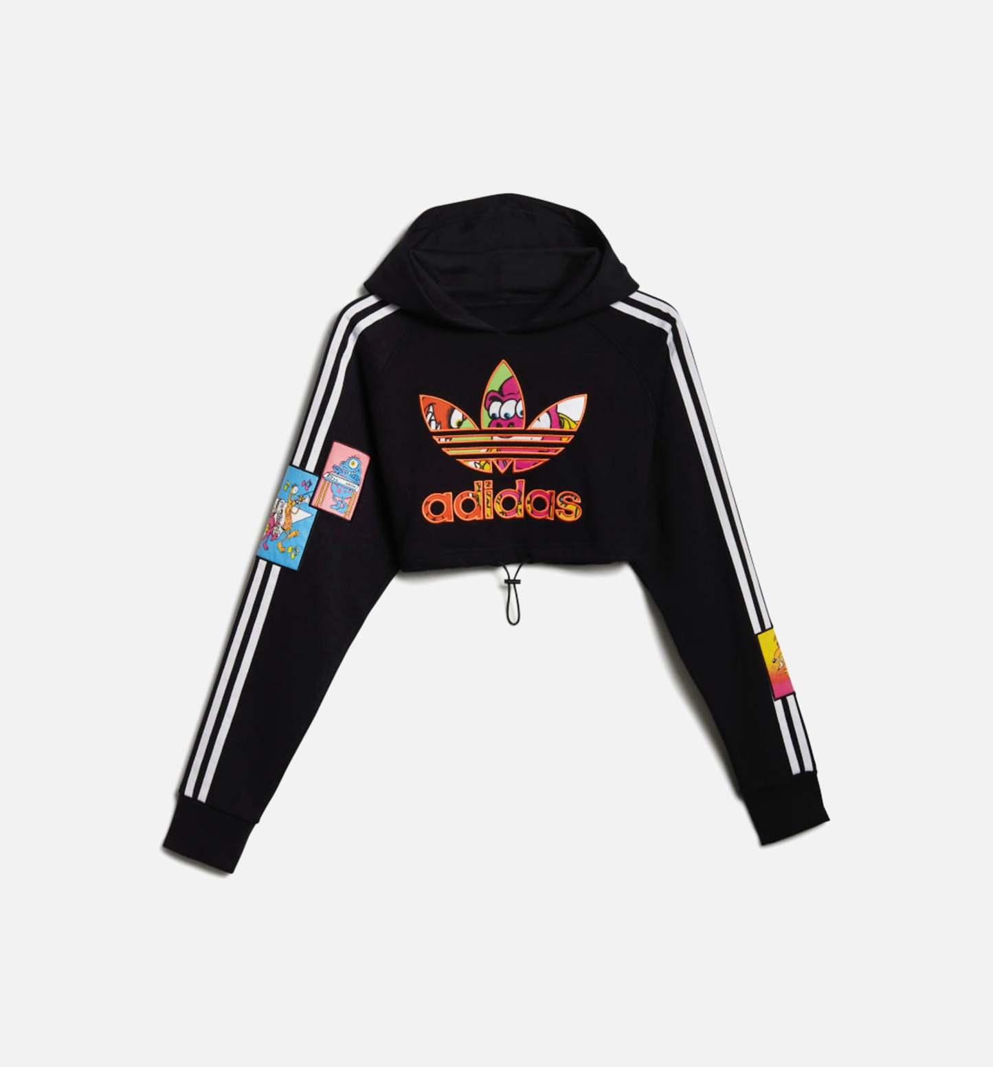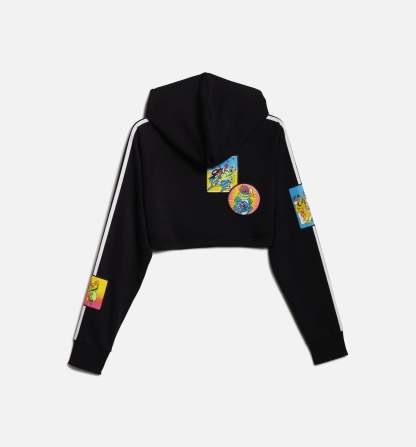 This adidas x Jeremy Scott Women's Cropped Hoodie presents a very 80s design with its cropped cut. The visible face of Moschino transforms this piece by including its funny characters in the adidas shamrock and decorating the rest of the sweatshirt with patches.