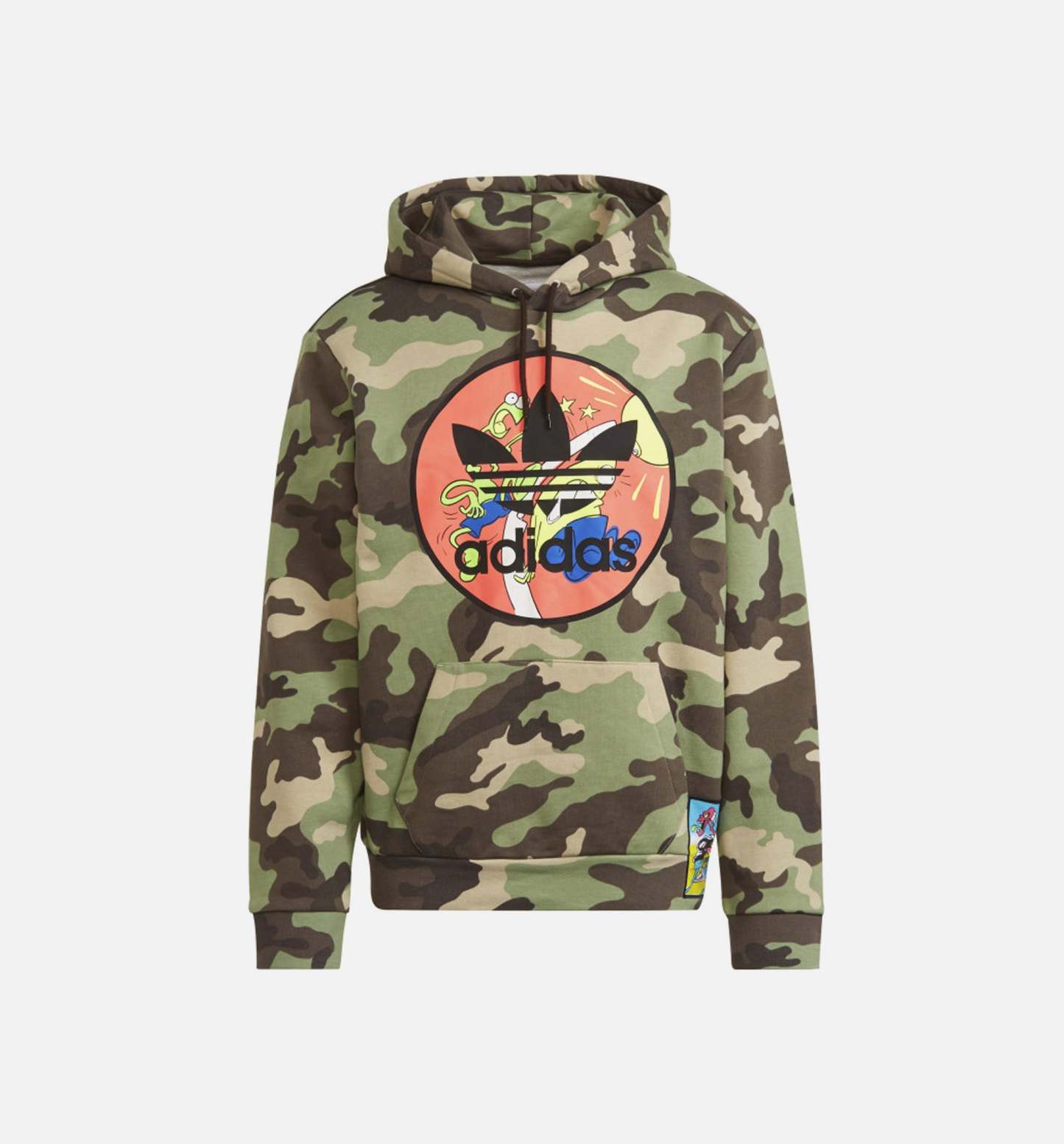 Casual can still be bold. This adidas x Jeremy Scott hoodie makes that undeniably clear. Settle into the feeling of soft fleece, but stand out wearing a strong camo print. Neon patches of the irreverent fashion designer's artwork add vibrant pops of color to your look.